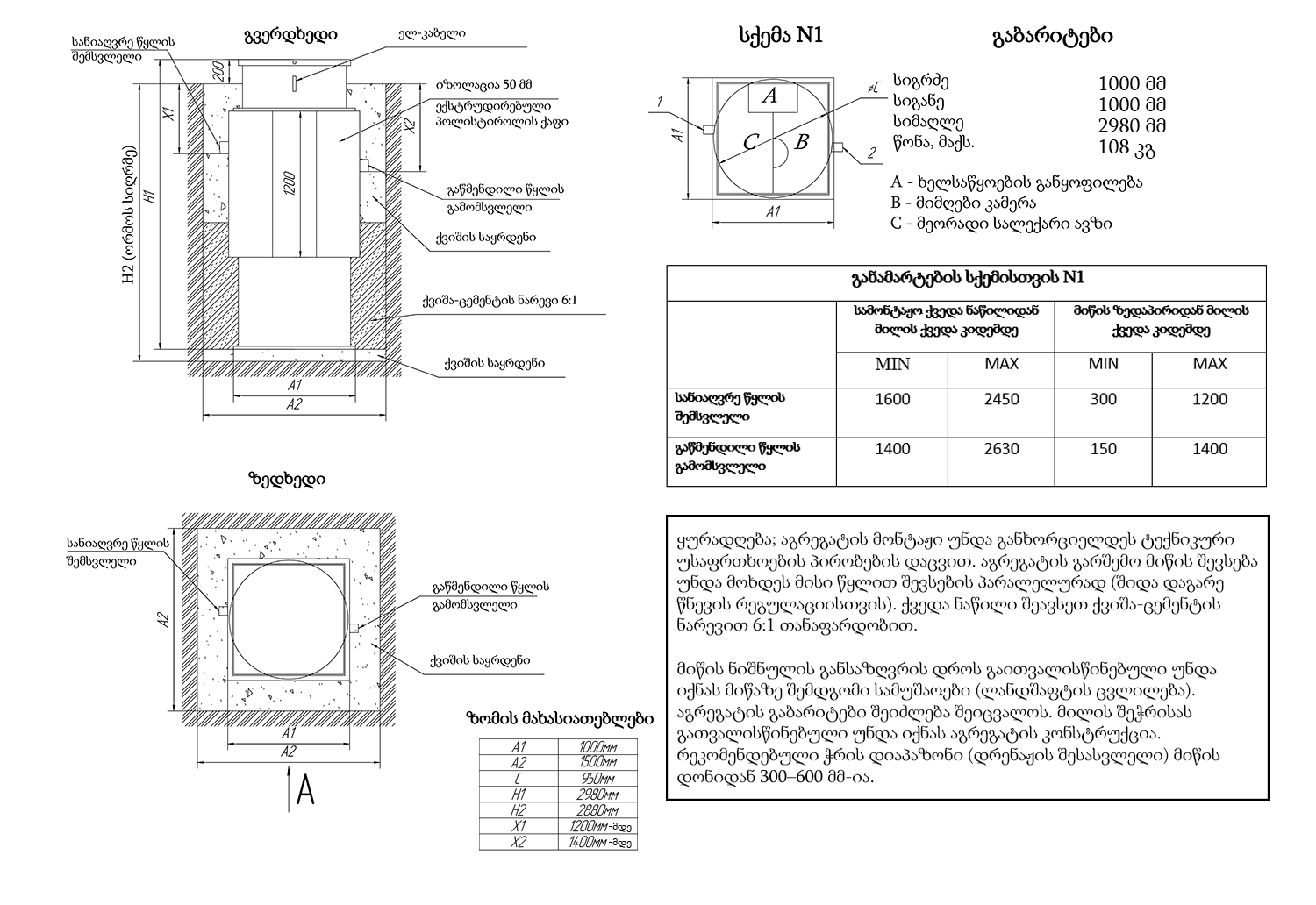 შემსვლელი მილის სიღრმე მიწის ზედაპირიდან 1200 (მმ)