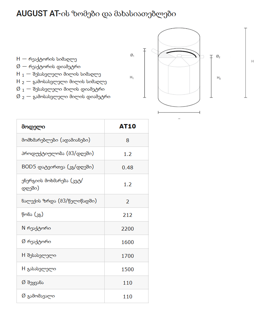 AT სერიის ყველა ბიოლოგიური გამწმენდი ნაგებობა შედგება ცილინდრული პოლიპროპილენის ბიორეაქტორისგან. შიდა მხარეს, რეაქტორი ტიხრებით იყოფა ექვს კამერად, რომელთაგან თითოეული ასრულებს ბიოლოგიური ჩამდინარე წყლების გამწმენდი კონკრეტული პროცესის შესრულებას. ყველა კამერა თანმიმდევრულად არის დაკავშირებული და ქმნის ვერტიკალურ ლაბირინთს, რაც საშუალებას იძლევა გამწმენდი ნაგებობის გამოყენება ელექტროენერგიის გათიშვის დროსაც კი.
