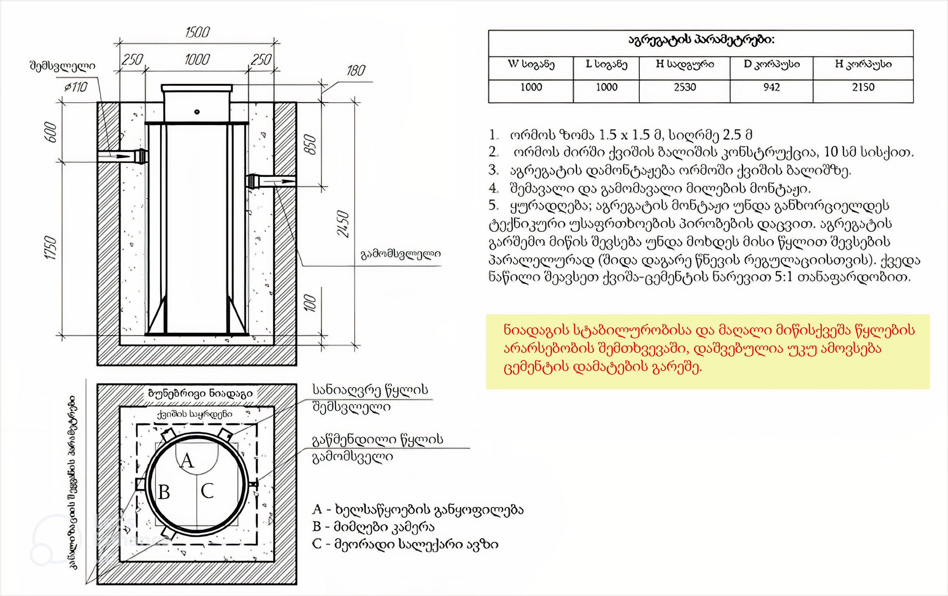 შემსვლელი მილის სიღრმე მიწის ზედაპირიდან 600 (მმ)