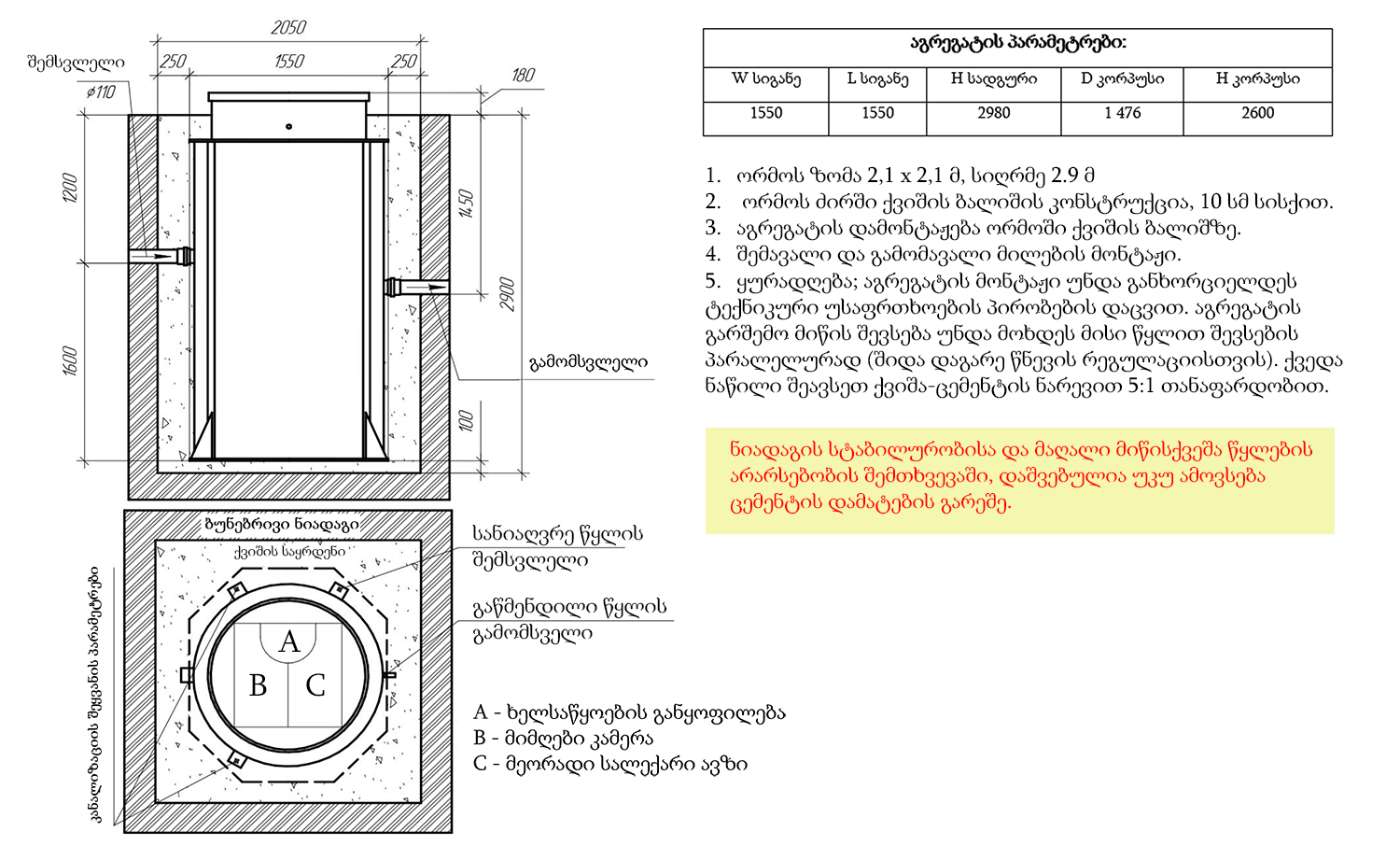 შემსვლელი მილის სიღრმე მიწის ზედაპირიდან 1200 (მმ)